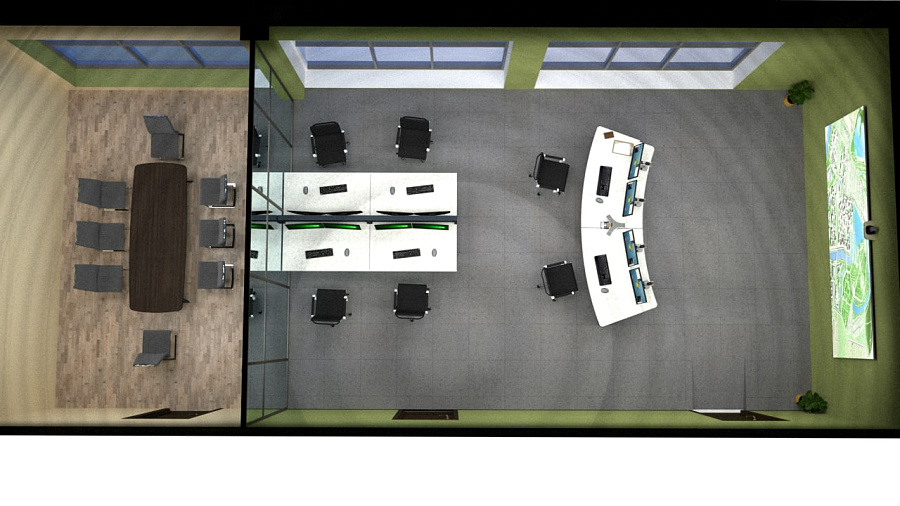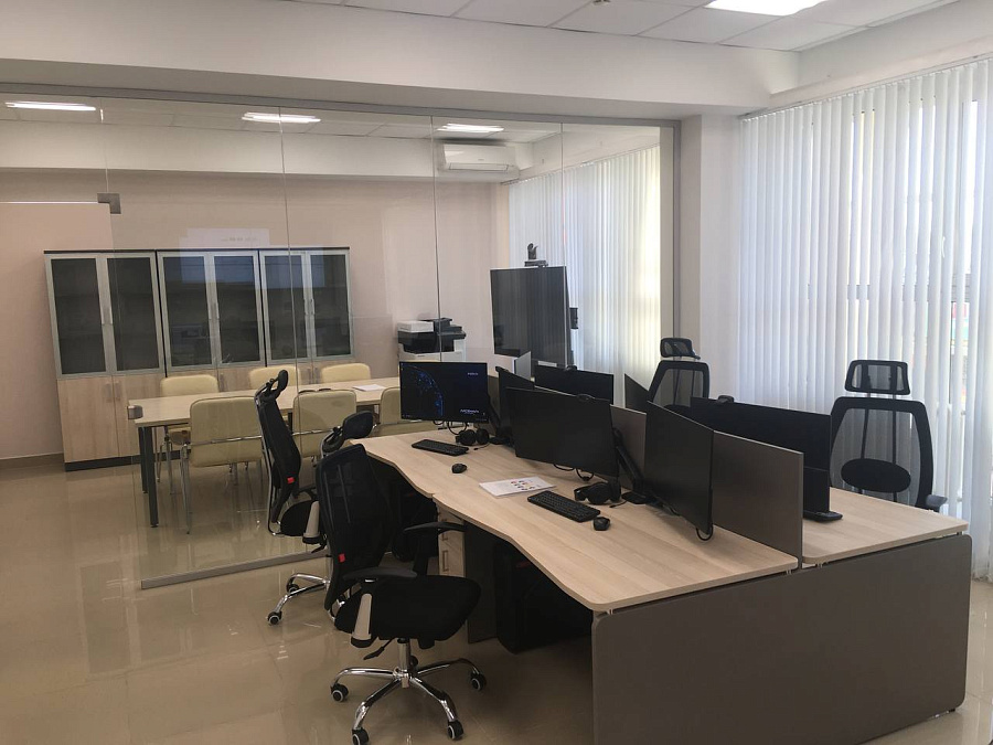 Диспетчерский центр включает в себя рабочую зону для операторов и аналитиков на шесть рабочих мест и переговорную комнату, каждое помещение оснащено системой ВКС. Спроектировали, поставили мебель и оборудование, произвели настройку систем под ключ.