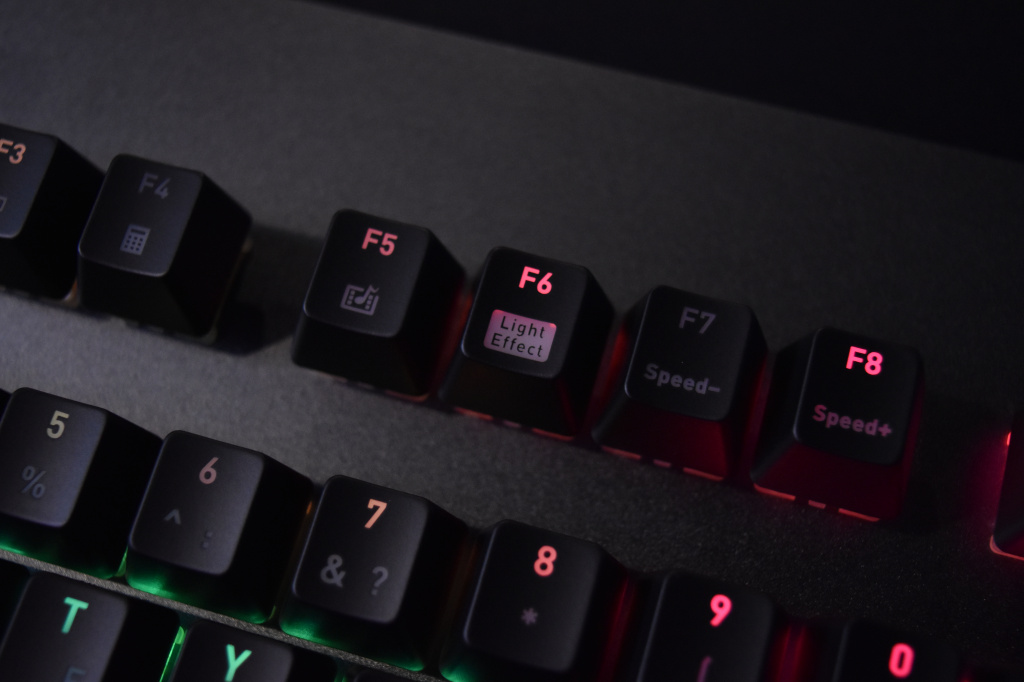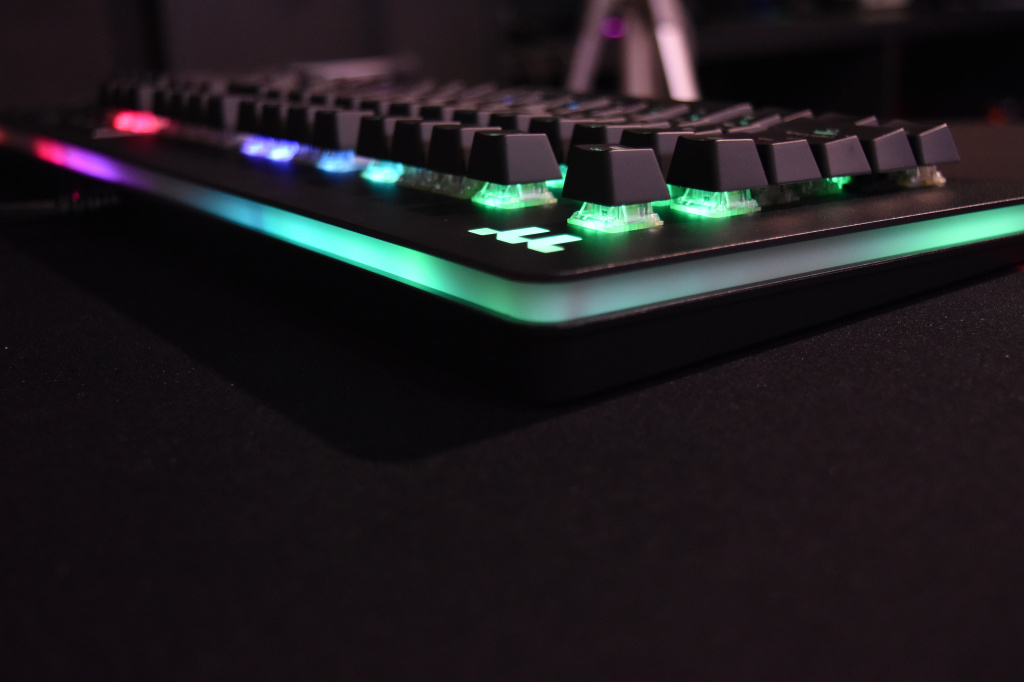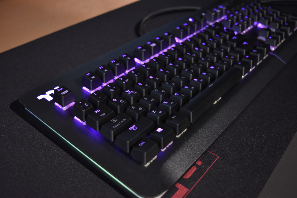 Большое дополнение к RGB-пиршеству – светодиодная полоса, расположившаяся между блоком с символьными клавишами и блоком с курсорными клавишами, о которой мы уже упоминали, но самое главное в TT Level 20 RGB – это прозрачная широкая световая панель по всему периметру корпуса клавиатуры. Благодаря ей RGB-подсветка выглядит шикарно. Других, более корректных и цензурных слов для описания подсветки в данной клавиатуре навряд ли можно подобрать. Разумеется, световая панель синхронизируется с общей подсветкой клавитуры, но благодаря фирменному софту, её свечение можно настроить отдельно.