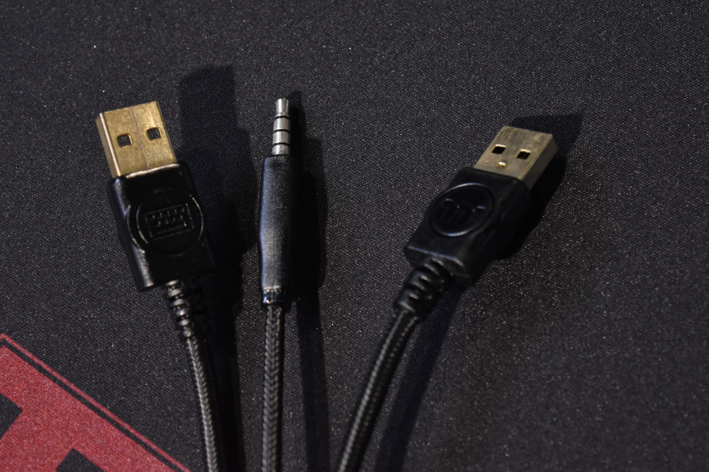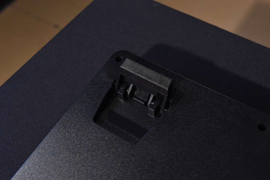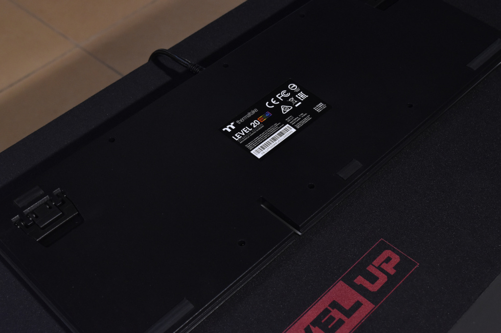 Из нестандартного можно отметить, разве что непривычно большое расстояние между двумя блоками клавиатуры. Здесь, внизу расположился небольшой вырез, который нужен для прокладки кабеля наушников или гарнитуры под основанием клавиатуры. А второй элемент – световая RGB-полоса. Оба элемента отлично вписываются и дополняют дизайн и внешний вид Thermaltake Level 20 RGB. На основании клавиатуры находится небольшая этикетка с базовой информацией по устройству и её серийным номером. Разумеется, игровой девайс оснащен прорезиненными ножками, чтобы клавиатура «не ездила» по столу. Всего таких ножек пять, четыре из которых находятся по углам, а одна снизу по центру. Благодаря им, TT Level 20 RGB очень прочно держится на столе и никуда не съедет даже, если очень захотеть. Этому также способствует достаточно большой вес устройства.