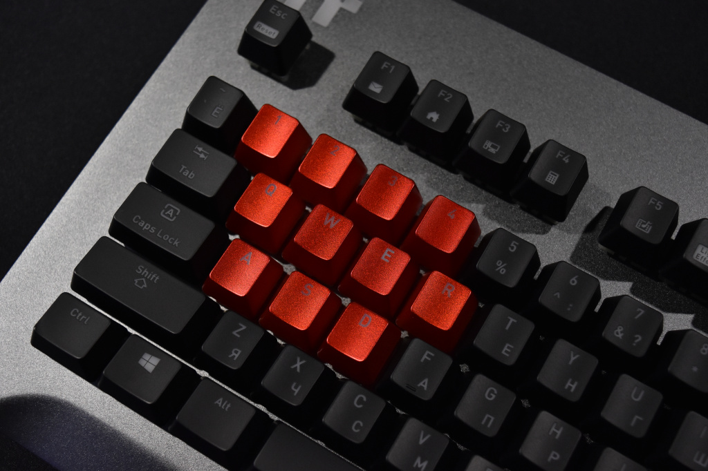 На них нанесены буквы английской раскладки, а вот при локализации для российского рынка на кейкапы русскую раскладку не нанесли. Такое уже было у клавиатуры X1 RGB, и мы отмечали это как один из недостатков сменных колпачков. Дело в том, что не все игроки умеют писать вслепую и не все наизусть знают или запомнили, какие буквы русской раскладки на каких клавишах находятся. Во время динамичного матча, это конечно же, не сильно заметно, но вот когда нужно что-то написать в чат, у некоторых игроков могут возникнуть проблемы, поэтому данный момент обязательно стоит учесть как перед установкой сменного комплекта кейкапов, так и перед покупкой клавиатуры.