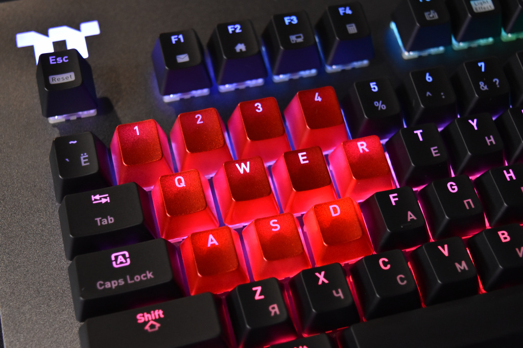 Количество одновременных нажатий – без ограничений, но этим сейчас мало кого удивишь, также, как и тем, что клавиши клавиатуры имеют ресурс в 50 миллионов нажатий. Этого должно хватить на всю жизнь, ну или пока клавиатура не сломается (в чем мы очень сомневаемся). Отдельно стоит рассказать про комплект сменных кейкапов, поставляемых в комплекте с клавиатурой. Всего их 11, и они нужны, чтобы заменить самые часто нажимаемые клавиши по мнению Thermaltake, а именно цифры 1-4, клавиши WASD, а также Q, E и R. Колпачки выполнены из аналогичного основным клавишам АБС-пластика, но красного цвета и с более гладкой поверхностью.