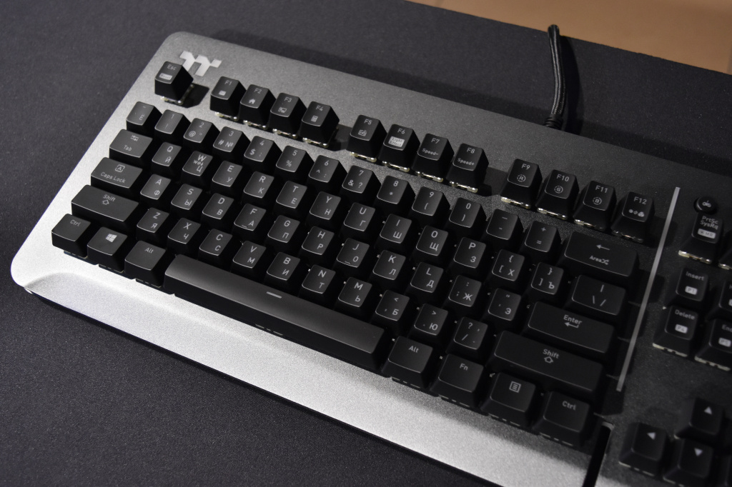 Level 20 RGB выпускается в двух вариациях цветов – серебристый (Titanium) и черный (Black), а также имеет три разновидности механических переключателей – Razer Green Switch, Cherry MX Blue и Cherry MX Silver. TT Level 20 RGB на первых двух переключателях в России не продается и навряд ли будет, зато нам достались клавиатуры на одних из самых быстрых переключателей MX Silver. Thermaltake предоставила нам на обзор и тестирование модель Titanium серебристого цвета и на переключателях Silver, но всё, что мы будем говорим о Level 20 RGB Titanium можно отнести и к Level 20 RGB Black.