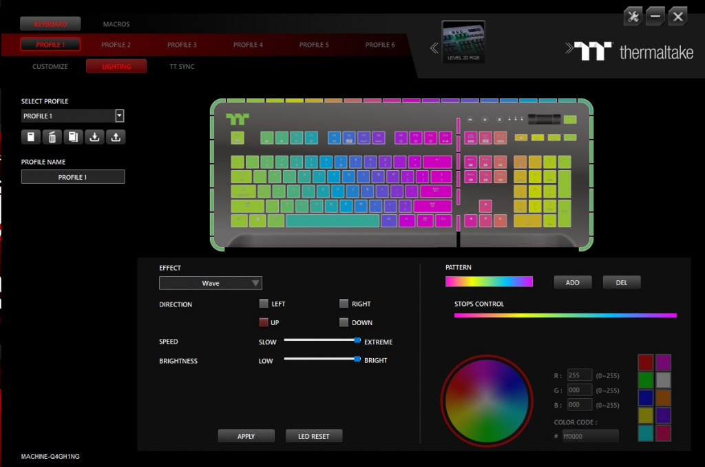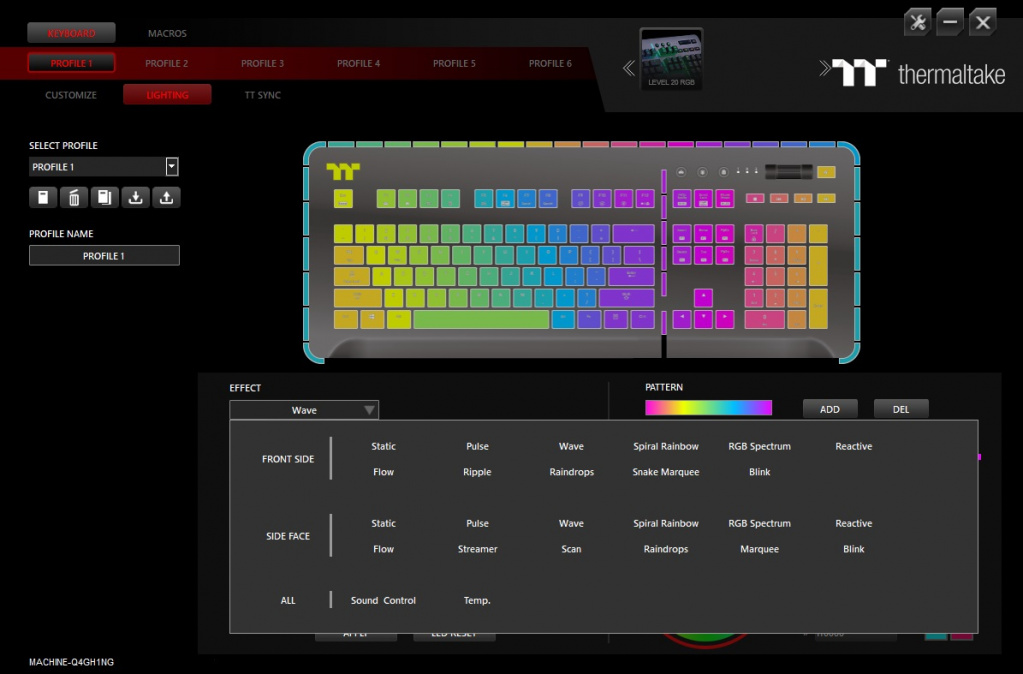 Для настройки клавиатуры Level 20 RGB используется фирменный софт TT iTake Engine, который позволяет тонко настраивать RGB-подсветку клавиатуры, переключаться между профилями и назначать макросы. В целом, набор стандартный. Макросы, к примеру, имеют полноценный редактор. Разумеется, есть несколько профилей, куда вы можете «забить» нужные настройки подсветки, синхронизации с другими устройствами и макросы. Всего профилей 6 и все сохраняются в память клавиатуры, чтобы Вы смогли переключаться между ними даже если, к примеру, взяли клавиатуру на LAN-турнир.