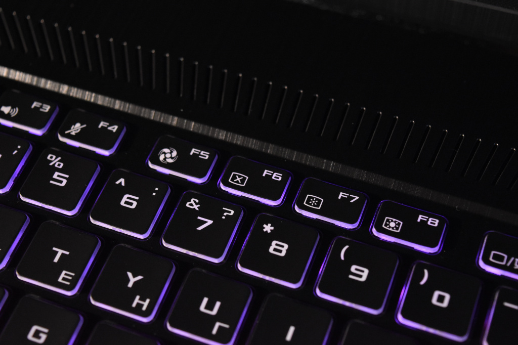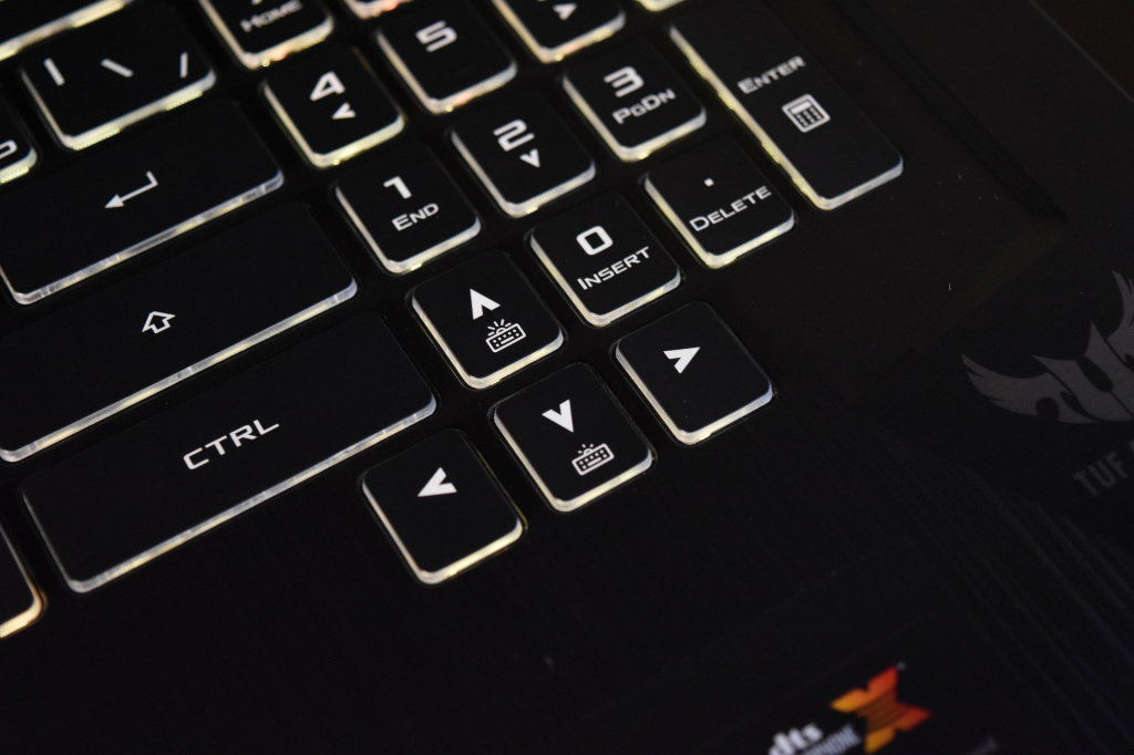 Среди устройств ввода лэптопа есть стандартный тачпад с имитацией нажатий на кнопки, а также мембранная клавиатура с трехуровневой RGB-подсветкой под стать всем трендовым игровым клавиатурам современности. Встроенная в данную модель ноутбука клавиатура имеет ход 1.8 мм, а клавиши WASD отличаются по материалу кейкапов от остальных. По всей видимости, ASUS TUF FX705GM-EW228T ориентирован для поклонников шутеров. Ресурс нажатий клавиш составляет 20 миллионов, ну а RGB-подсветка настраивается с помощью фирменного софта TUF Aura Core.