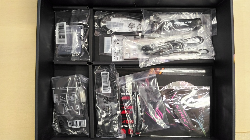 С геймерской материнской платой, как правило, поставляется расширенный комплект различных аксессуаров. ROG STRIX X99 – не стала исключением. В комплект поставки входит диск с драйверами на материнскую плату, 4 SATA-кабеля для подключения накопителей, SLI-мостик, Wi-Fi антенна, переходник Q-Connector и заглушка на заднюю стенку корпуса. В качестве бонуса в комплекте поставляется несколько наклеек на корпус, чтобы обозначить, что пользователь использует продукцию серии ROG, а также набор стикеров для радиаторов материнской платы для тех пользователей, которые используют корпуса с акриловыми окнами и очень щепетильно относят к внешнему виду «внутренностей» своего компьютера.