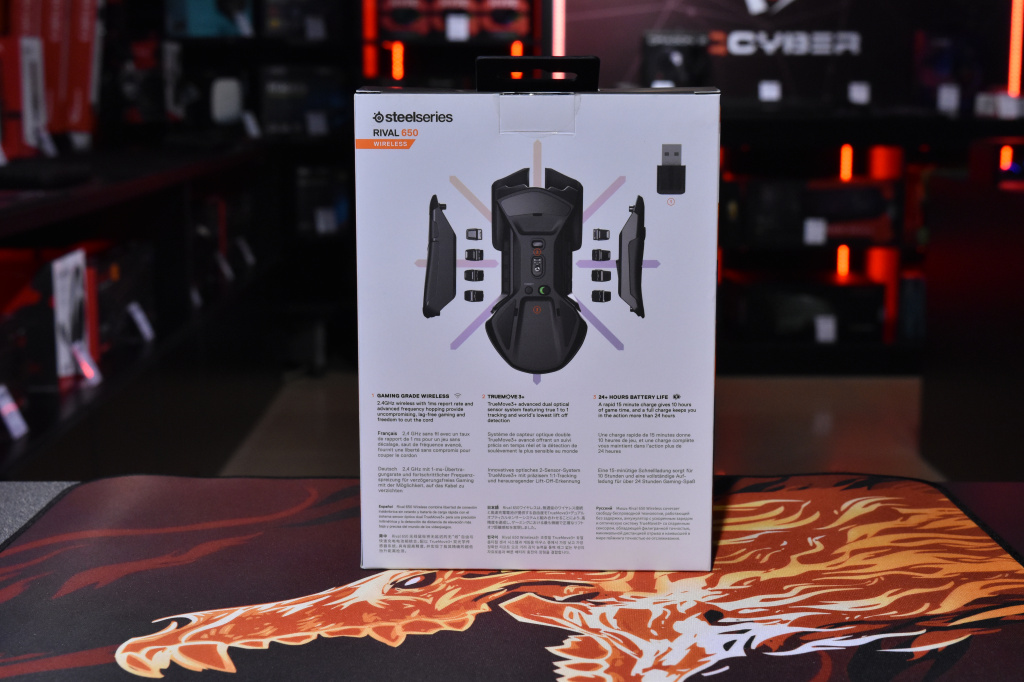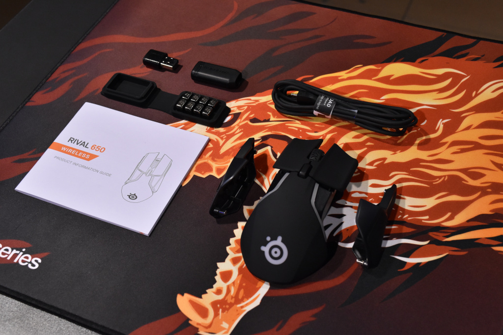 Мышь поставляется в небольшой коробке, на которой изображено само устройство в полуразобранном виде, демонстрирующее систему регулировки веса Rival 650. Среди особенностей мышки, производитель решил выделить более 24 часов работы без подзарядки, несколько оптических сенсоров, а также беспроводную работу геймерского девайса. Внутри игрок помимо самой мышки найдет небольшую инструкцию, передатчик для беспроводной работы Rival 650, кабель в НЕ тканевой оплетке для работы мыши в проводном режиме и её подзарядки, а также 8 грузиков по 4 грамма, упакованных в компактную резиновую основу.