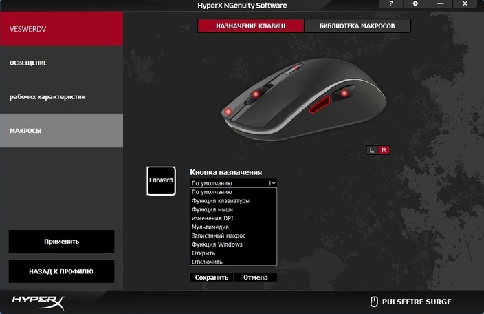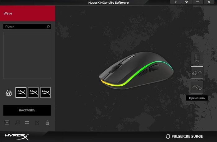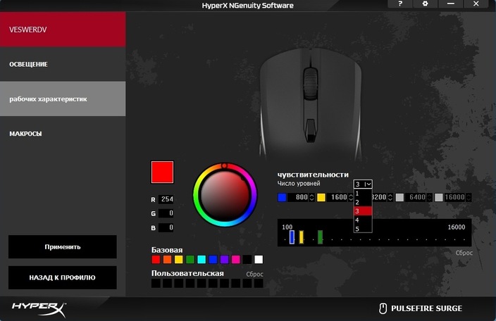 Что касается программного обеспечения, то Pulsefire Surge – это первая мышь в линейке, которая получила поддержку фирменного софта HyperX под названием «NGenuity Software». Программа интуитивно понятная и предоставляет геймеру полный комплект инструментов для персонализации настроек и параметров мышки. Помимо привычной настройки чувствительности от 100 до 16 000 dpi с шагом в 50 dpi, а также настройки профилей, записи макросов и переназначения клавиш, NGenuity Software преподносит некоторые сюрпризы. Например, при персонализации RGB-подсветки можно полностью настроить цвет, яркость и эффект свечения каждого из 32 светодиодов. Такого мы еще не видели ни в одной мышке.