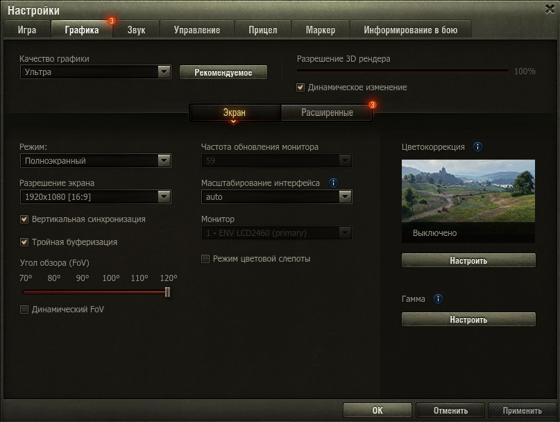 Остальные параметры, такие как: монитор, режим цветовой слепоты, цветокоррекция и гамма, которые находятся в окне «Экран» в настройках графики никак не влияют на производительность World of Tanks.