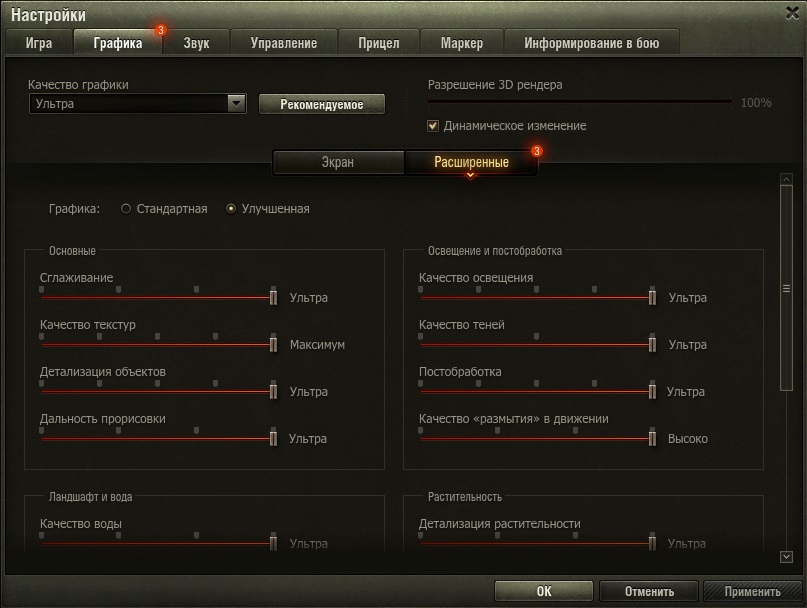 Выбор между стандартной и улучшенной графикой максимально влияет на производительность и количество fps в World of Tanks. Переключение на стандартную графику отключает большинство расширенных настроек, которые сильно влияют на детализацию и производительность игры. На относительно слабых системах рекомендуем выставлять этот параметр на стандартный.